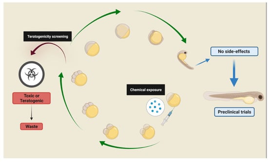 - Cassar, S.; Adatto, I.; Freeman, J.L.; Gamse, J.T.; Iturria, I.; Lawrence, C.; Muriana, A.; Peterson, R.T.; Van Cruchten, S.; Zon, L.I. Use of Zebrafish in Drug Discovery Toxicology. Chem. Res. Toxicol. 2020, 33, 95–118. [Google Scholar] [CrossRef] [Green Version]
