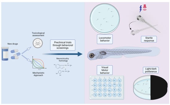 Zebrafish have been used when it is desired to correlate behavioral patterns, such as cognition, social interactions, and locomotor activity, with physiological evidence of a specific disorder. Different methods and disease-relevant models, which are capable of producing reliable information for behavioral pharmacology, have been developed and adapted for zebrafish to use in neurological drug screening during the last decade [,,,]. The effects of different new compounds on brain development can be assessed by different neurobehavioral parameters, including swimming capacity and functionality of the motor, sensory, and stress-regulating systems.