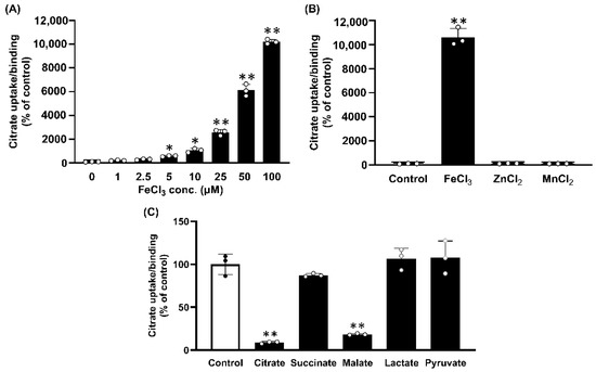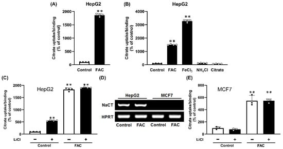 Human NaCT is stimulated by Li+ [11,12,13]. To determine whether the citrate uptake/binding that was enhanced by FAC treatment occurred via NaCT, we measured citrate uptake/binding in control and FAC-treated HepG2 cells in the absence and presence of 10 mM LiCl. In control cells, Li+ stimulated the citrate uptake 5-fold, as expected of the NaCT (Figure 1C). FAC treatment increased citrate uptake/binding several-fold, but the effect of Li+ was minimal in FAC-treated cells (Figure 1C). If the citrate uptake in control cells was subtracted from that in FAC-treated cells, the activity that was enhanced by FAC treatment was less in the presence of Li+. We then used the human breast cancer cell line MCF7; these cells do not express NaCT irrespective of whether or not the cells were exposed to FAC (250 μg/mL) (Figure 1D). We then used control and FAC-exposed MCF7 cells for citrate uptake/binding. In control cells, citrate uptake/binding was very low compared to HepG2 cells (0.4 ± 0.1 pmol/106 cells/15 min in MCF7; 18.0 ± 0.4 pmol/106 cells/15 min in HepG2) and was insensitive to Li+ (Figure 1E). In FAC-treated cells, citrate uptake/binding increased 6-fold and Li+ had little effect (Figure 2C). As there was no evidence of NaCT mRNA in MCF7 cells with or without exposure to FAC, the presence of robust citrate uptake/binding in FAC-treated cells indicates that the observed uptake/binding activity is unrelated to NaCT. In HepG2 cells that express NaCT, there was no noticeable difference in mRNA levels for the transporter between the control and FAC-treatment (Figure 1E).