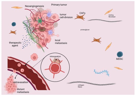 Schematic presentation of TME elements that induce immunosuppression, tumor progression, and metastasis. TME constitutes a surrounding stroma with a wide variety of cells, such as immune cells, fibroblasts, as well as many regulatory molecules, which are considered potential druggable targets. MDSC, B and T regulatory cells, TAMs, and cancer-associated fibroblasts (CAFs) have quite significant implications for cancer management, as they elicit an immunosuppressive effect that limits the efficacy of immunotherapeutic agents. TME immunosuppression is attributed to various molecules secreted by cancer cells, such as inhibitory checkpoints leading to the recruitment of immune cells, including MDSCs, T regulatory cells, and TAMs. This figure was created with BioRender.com, accessed on 14 May 2022 (agreement number UO23X0OEMQ).