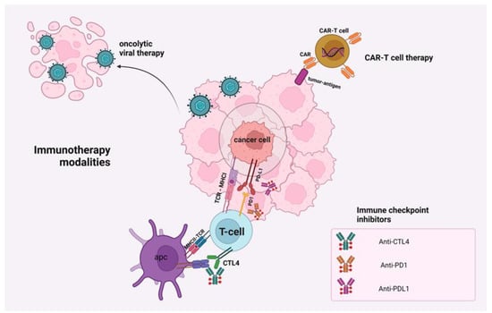 The immune system has a significant impact on tumor progression and therapeutic efficacy. It can be modulated either in an active or a passive manner. The former approach utilizes vaccines, which trigger an anti-cancer immune response via presenting tumoral antigens to immune cells in order to eliminate the malignant cells, while the latter approach includes the administration of immune cells and antibody-based treatment. Immune checkpoint inhibitors are monoclonal antibodies (mAbs) that interact with PD-1, as well as CTL-4 with concomitant stimulation of T cells (effector). These mAbs block the proteins on the surface of T-cells or on the surface of cancer cells. The stimulation of PD-L1, PD-1, and CTLA-4 proteins on T cells impedes the recognition of cancer cells and prevents their elimination. Blocking these proteins permits the activation of T-cells and the destruction of cancer cells, as well as the control of tumor growth and recurrence. The mechanism of action of cancer vaccines includes the stimulation of T-cells through the administration of messenger RNA (mRNA) or other types of vectors (viral, bacterial, or yeast-based vaccines). Another modality is CAR-T cell treatment, based on genetically engineered T cells of the patient, whereby a gene responsible for the production of the CAR protein is inserted in the cells’ genome. After the CAR-T cells are infused in the patient, the extracellular antigen recognition domain (ectodomain) of chimeric antigen receptor (single-chain Fragment variant (scFv)) interacts with the neoantigens or other proteins on the surface of malignant cells [21,22,23]. Thus far, there are five generations of CAR-T cells which are differentiated by the intracellular signaling domain [23]. The (i) first generation of CAR-T cells include a ζ-chain intracellular domain that does not present a sufficient response, while there is a need for exogenous IL-2 supplementation. The (ii) second generation of CAR-T cells include OX-40, or CD28, and 4-1BB intracellular domains. The latter can be activated in the absence of the antigen, a phenomenon called constitutive stimulation. The (iii) third generation combines various costimulatory signaling domains with similar effects to the second generation. The (iv) fourth generation comprises the so-called “TRUCK” T cells that include a cytokine, such as IL-12, which leads to a cytokine-mediated killing of cancer cells via the attraction and the activation of additional immune cells, while the (v) fifth generation includes IL-2 receptors that induce JAK/STAT pathway activation [24,25]. Additionally, there are mAbs with a scFv that interact with T-cells (effector) and prevent the stimulation of cytokines, which either induces or suppresses the immunological response. Furthermore, the antibody-based therapy represents a promising therapeutic modality for the management of solid tumors. The introduction of bi- and tri-specific antibodies is considered a revolutionary approach. The former includes one arm specialized for CD3 and a second arm targets the neoantigen, while the stimulation of T cells is achieved without the involvement of MHC [21,26]. Finally, there is another immunotherapy modality based on the depletion of regulatory T cells (Treg), for example daclizumab, a monoclonal antibody against CD25 of Tregs [27].