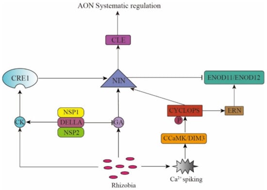 There is a symbiotic relationship between rhizobia and legume plants that forms via mutual recognition. Flavonoids secreted by the plant roots and the rhizobial nodulation factors results in Ca2+ oscillations in the plant cell nucleus, which are recognized by the Ca2+-calmodulin-dependent protein kinase, which helps phosphorylate the corresponding transcription factors, and subsequently affects the expression of specific genes, thereby ultimately resulting in nodule formation. The AON pathway controls the nodulation process according to soil rhizobia abundance and soil nitrogen content and also maintains the energy balance in the plant. Therefore, the AON pathway is inseparable from the recognition of and response to rhizobial and the NO3− signals. Ethylene (ET), cytokinin (CK), gibberellin (GA), and other plant hormones, along with the transcription factors, mediate the recognition of and response to these signals, together forming a complex regulatory network [].