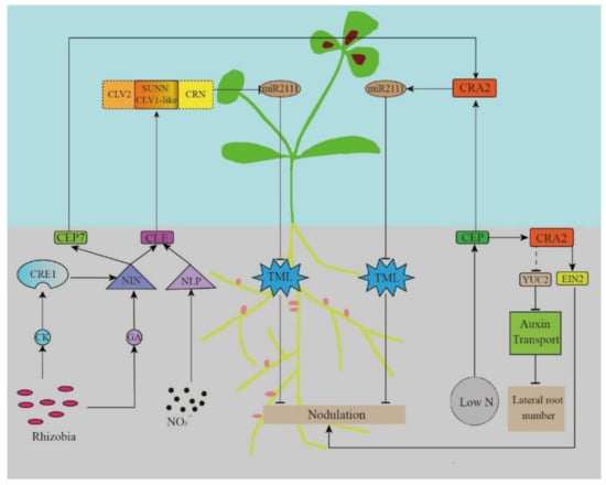 The nodule number and its development in legumes are strictly limited by the negative feedback regulation of long-distance signals from the roots to shoot buds and back to roots, which is called nodule self-regulation (autoregulation or AON). The AON pathway involves systemic regulation in the root–soil–shoot continuum, including the CLE-SUNN negative regulatory pathway and the CEP-CRA2 positive regulatory pathway. When nitrogen and rhizobia were abundant in the soil, the rhizobial signal can affect the CK concentration, and CRE1 and NIN can trigger the CLE signal transduction. NO3− can also trigger the CLE signal transduction by affecting the activity of the NLP transcription factor. When plants are deficient in nitrogen, the rhizobial signal promotes the expression of MtCEP7 through CK/CRE1 and NIN signaling. After the CLE and CEP signals are recognized by SUNN and CRA2, respectively, the downstream signal from the shoot buds to the roots is conducted by the shoot bud-produced miR2111. Activated SUNN and CRA2 inhibit and promote the formation of miR2111, respectively, and then miR2111 negatively regulates the TML expression in the roots. This systemic regulatory pathway allows the nodulation capacity of the legume roots to be fine-tuned, depending on the nitrogen utilization.