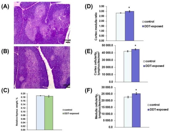 The investigations have showed that most known endocrine-disrupting chemicals penetrate the placental barrier [,,]. Some of them exert a dismorphogenic effect on developing fetal organs []. After birth, endocrine disruption may also negatively influence the program of postnatal development []. In our previous investigations, we revealed some changes in the thymus morphology of newly born rats, exposed in utero to low doses of dichlorodiphenyltrichloroethane (DDT) []. DDT is one of the most wide-spread endocrine-disrupting chemicals on the planet []. It persists in water and soil for at least seven decades, and is found in 99.9% of neonate, infant, and adult blood samples []. This suggests different deviations in the pre- and postnatal development of the endocrine system and the immune system. DDT has been shown to interfere with sex-steroid production and earlier onset of puberty, which is crucial for thymic involution [,]. Thymic involution is characterized by a loss of weight, reduction in the cortex/medulla ratio, decreased cortex cellularity, depletion of subcapsular lymphoblasts, and replacement of epithelial stroma by connective and adipose tissue [,]. The hormones of the pituitary–gonadal axis are known to regulate all the above-mentioned processes [,]. Since DDT is a recognized antagonist of androgen receptors [], it may prevent androgen binding and signaling by thymic cells and possibly alter postnatal development and involution. DDT also has been found to interfere with transcriptional regulation of endocrine glands development by affection of Wnt, Oct4, and Sonic Hedgehog signaling [,,]. It suggests that DDT may also compromise thymus function by disruption of postnatal morphogenesis. Since thymus involution is an evolutionarily conservative process in mammals, its onset is associated with the implementation of the morphogenetic program of the organ, and not only with hormonal control of aging. This allows us to hypothesize that endocrine disruptors can fundamentally change the process of involution as a part of developmental program both by accelerating and slowing down. The disruption of the immune system development by low-dose exposure to DDT is still obscure and requires thorough investigations. The aim of the present study was to evaluate age-related changes in the thymus of post-pubertal rats exposed to DDT during prenatal and postnatal development.