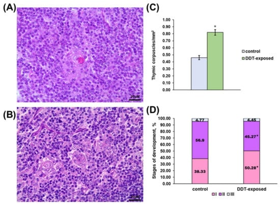 Besides higher lymphocyte density, the medulla demonstrated altered thymic epithelial cell turnover. The number of thymic corpuscles in 1 mm2 of medulla was double that in the control (Figure 2C). The stages of thymic corpuscles’ development also differed. In the intact rats, more than half of the corpuscles were in the second stage of development (Figure 2A,D). In the DDT-exposed rats, thymic corpuscles in the first stage of development prevailed (Figure 2B,D).