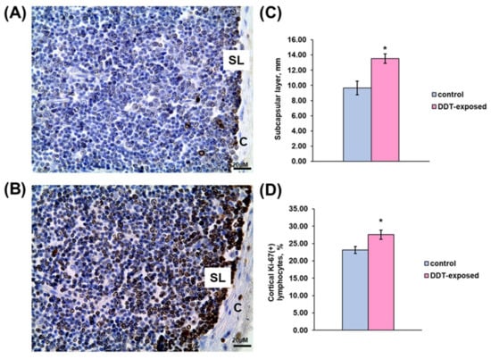 Immunohistochemical evaluation of Ki-67-positive cortical lymphocytes in prenatally and postnatally exposed to DDT and intact adult rats aged 10 weeks. Distribution of proliferating thymocytes in the control (A) and DDT-exposed (B) rats. C—capsule, SL—subcapsular lymphoblasts. Magnification 400, scale bar 20 µm. Width of subcapsular layer of mitotically active lymphoblasts (C), percentage of Ki-67-positive thymocytes in the cortex (D). Data presents as mean ± S.E.M. p < 0.05 compared to the control (*).