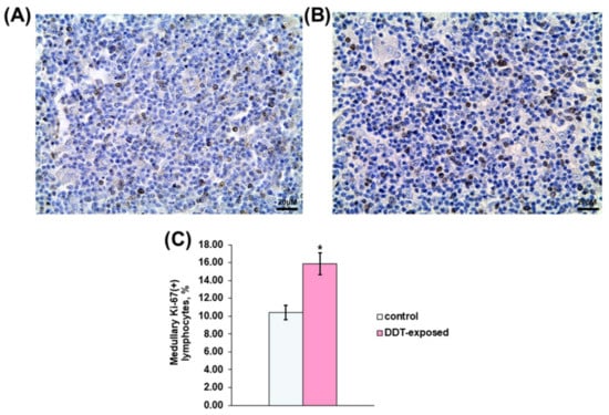 Immunohistochemical detection also revealed Ki-67-positive thymocytes in the medulla. In the control rats, proliferating lymphocytes were scattered in the medulla (Figure 4A). Their percentage was twice less than in the cortex. Unlike the control, the DDT-exposed rats showed a 1.5-times higher percentage of dividing lymphocytes (Figure 4C). They also were diffusely distributed in the medulla (Figure 4B).