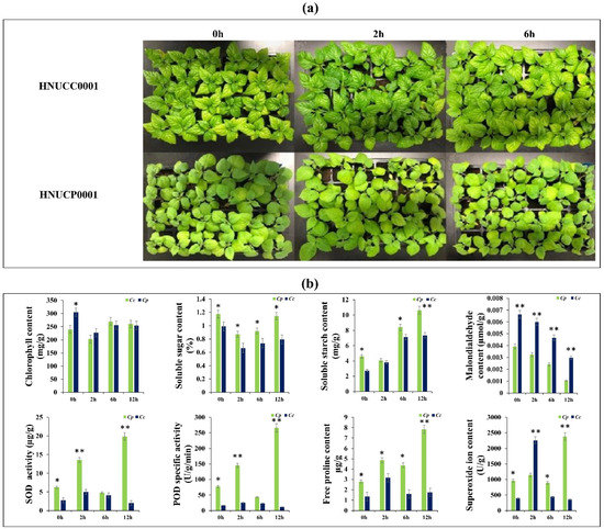 (a) Phenotypic representation of the C. pubescens and C. chinense pepper plants subjected to cold stress at different time points. (b) Response of morphological and biochemical indexes of the C. pubescens and C. chinense pepper plants subjected to cold stress at different time points. Data represent means ± S.E. of three replicates. Asterisks indicate significant differences (* p > 0.05, ** p > 0.01, Student’s t-test).