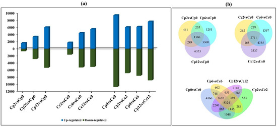 The expression profile of cold-treated and non-treated pepper plants of C. pubescens and C. chinense were analyzed using RNA-seq. A total of 6 GB of clean data was obtained for each sample. After screening the raw data, 44–65 M clean reads were obtained with an error rate of 0.03. The percentage of Q20 was more than 95%, the percentage of Q30 was more than 88%, and the content of GC was more than 41% (Table S1). Comparing the obtained clean reads with the reference genome, at least 82% of the clean reads in C. chinense were mapped to the reference genome, of which more than 78% were uniquely located; at least 68% of the clean reads in C. pubescens were mapped to the reference genome, of which more than 65% were uniquely located. A total of 20145 DEGs were identified in different comparisons among and between both species. Interestingly, the number of DEGs increased in both species as the stress period prolonged (Figure 2a). Furthermore, 1386, 2711, and 8324 commonly enriched DEGs were identified in different comparisons (Figure 2b). A complete list of DEGs is presented in Supplementary File S1.