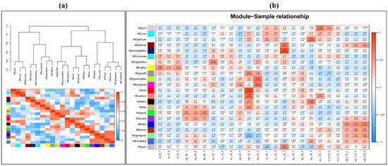 WGCN analysis of cold-tolerant and cold-sensitive samples under different time durations of cold stress. (a) Genes were assigned to one of the 22 modules. The sequence diagram is shown at the top of the image. The bottom of the figure shows the different color gene modules and the number of bases they contain. (b) Correlation analysis between module and sample. The number on each cell is the correlation coefficient between each module gene and sample, and the number below is the corresponding p-value. Among these modules, the blue module is the most relevant to cold resistance.