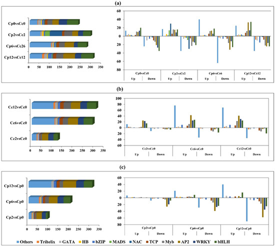 We found 11 families with at least one gene matching the DEG dataset among the 81 TF families predicted in the Arabidopsis TF database. In response to cold stress, 332 transcription factors were identified in C. pubescens leaves, including 231 that were upregulated and 101 that were downregulated at 12 h of cold stress (Figure 4a). In most TF families, the number of upregulated genes was higher than the number of downregulated genes during cold stress compared to the control. A total of 326 transcription factors were identified in C. chinense leaves, including 152 that were upregulated and 174 that were downregulated at 12 h of cold stress (Figure 4b). In most TF families, the number of genes that were downregulated was higher than the number of genes that were upregulated during cold stress compared to the control. While comparing C. pubescens vs. C. chinense, there was more upregulation of some TF families, such as HSF, FAR, and bHLH. Additionally, more active participants were identified in the GRAS, WRKY, AP2, BZIP, MYB, DOF, and ARF families, all of which play key roles in regulating cold-sensitive structural genes (Figure 4c).