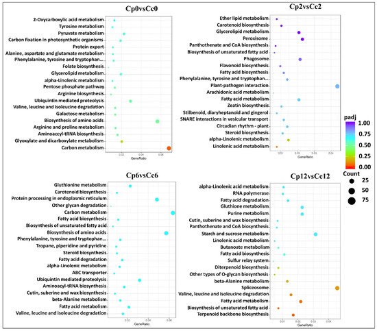 KEGG enrichment analysis of DEGs in the cold-treated C. pubescens and C. chinense pepper seedlings. The ordinate indicates the pathway name, and the abscissa is the enrichment factor. The size of the circle indicates the number of genes enriched in the KEGG pathway, and the color of the circle represents the p-value.