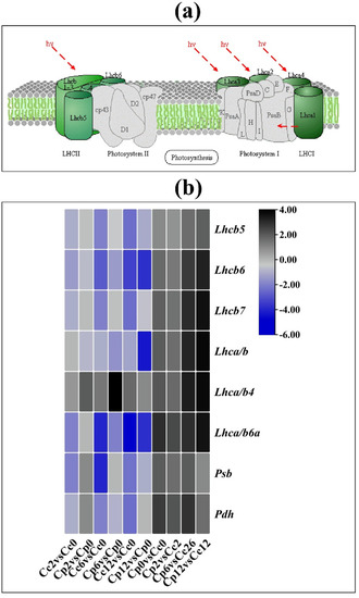 (a) Schematic representation of light harvesting pathway in plants (KEGG: Kyoto encyclopedia of genes and genomes). (b) Differentially expressed photosynthetic pathway genes in the cold-treated C. pubescens and C. chinense pepper seedlings at different time points.