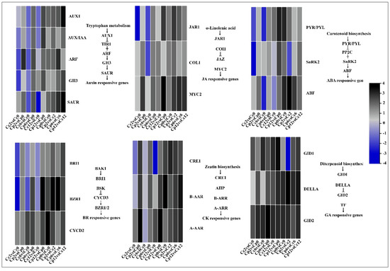 Hormone signaling is critical for hormone-induced biochemical changes in plant growth, development, and environmental responsive pathways. In this study, five DEGs involved in auxin signal transduction were enriched. Aux1, GH3, and SaUR were significantly upregulated at 12 h of cold stress in C. pubescens. Furthermore, the expression of these genes was significantly expressed in C. pubescens compared to C. chinense. Cytokinin signal transduction, gibberellin signal transduction, abscisic acid (ABA) signal transduction, ethylene signal transduction, brassinolide signal transduction, salicylic acid (SA) signal transduction, and jasmonic acid (JA) signal transduction were also identified (Figure 7, Supplementary File S1). Among the ABA-related genes, PYR/PYL and ABF were most enriched in C. pubescens at 12 h cold stress. Interestingly, there was no significant change in gibberellin-related genes in C. pubescens vs. C. chinense in non-treated plants, but during the cold stress period, gibberellin-related genes showed higher expression levels in C. pubescens plants compared to C. chinense. The change in gibberellin-related genes in response to cold stress suggests their involvement in the cold-stress tolerance of C. pubescens seedlings. Interestingly the BZR1/2 transcription factor responsible for inducing BR-regulated genes showed significantly higher expression in C. pubescens leaves under stress conditions than C. chinense (Figure 7).