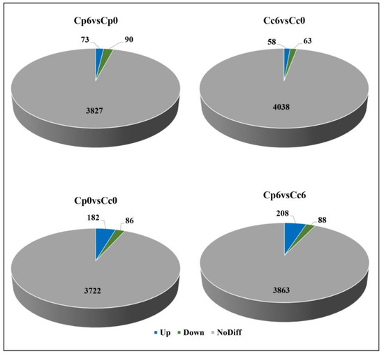 The overall number of differentially accumulated metabolites in the in the cold-treated C. pubescens and C. chinense pepper seedlings after 6 h of cold stress.