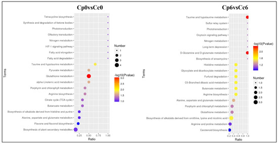 KEGG enrichment analysis of DAMs in the cold-treated C. pubescens and C. chinense pepper seedlings. The ordinate indicates the pathway name, and the abscissa is the enrichment factor. The size of the circle indicates the number of genes enriched in the KEGG pathway, and the color of the circle represents the p-value.