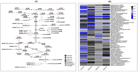 Overview of primary and secondary metabolic pathways during cold stress. (a) Changes in the metabolites associated with the pathways after cold stress in C. pubescens and C. chinense seedlings. (b) Expression patterns of the genes involved in metabolic pathways after cold stress in C. pubescens and C. chinense seedlings.