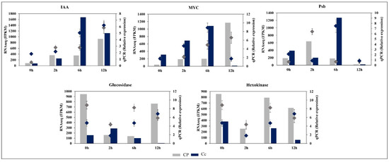 The expression profiles of significantly differentially expressed genes were measured by RNA-seq and qRT PCR. The histogram data represent the RNA-seq data (left Y-axis) and the marker represents the qRT-PCR data (right Y-axis).