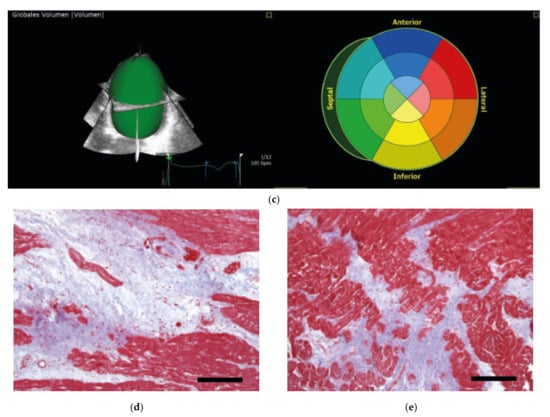 Echocardiographic data of the index patient under clinical deterioration before VAD therapy (a–c) and histochemical analysis of the explanted heart (d,e). (a) Four-chamber view showing the dilated left ventricle (LV) with intracavitary thrombotic material (red arrows). (b) Deformation analysis of global longitudinal strain values using 2D speckle tracking imaging with markedly impaired left ventricular average strain of–7.8%. (c) 3D-echocardiography of a LV full-volume dataset using Tomtec LV-Analysis 3 for volumetric assessment. The LV is enlarged more than twice the normal size (end-diastolic volume = 294.6 mL and end-diastolic volume index = 181.0 mL/m2) with a reduced ejection fraction of 20.7%. (d,e) Masson’s trichrome staining of myocardial tissue obtained from the explanted heart. Pronounced interstitial fibrosis is observed in the left (d) and the right (e) ventricles. Scale bars = 200 µm.