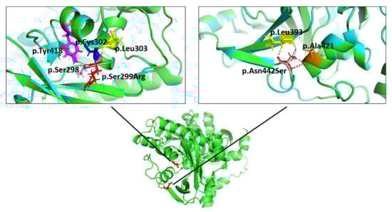 Structures for wildtype and mutant fukutin were calculated with ColabFold [23]. Structures with the highest per-residue confidence metric (predicted Local Distance Difference Test, pLDDT with 100 = most confident) were chosen (wildtype: pLDDT = 92.19, p.Ser299Arg: pLDDT = 92.17, and p.Asn442Ser: pLDDT = 91.69) and aligned pairwise (Figure 5). In the p.Ser299Arg mutant, an additional polar contact for residue 299 was observed, compared with the wildtype. In the p.Asn442Ser mutant, no changes of the polar contacts for residue 442 were observed between the mutant and wildtype. No major structure changes were detected in the alignment between the wildtype and mutant proteins.