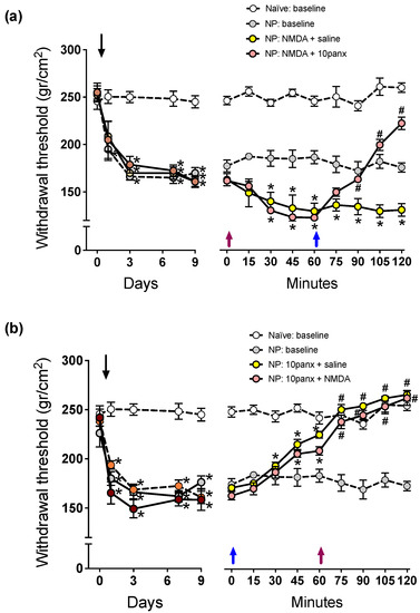 Effect of intrathecal administration of NMDA followed by 10panx, or 10panx followed by NMDA, on the mechanical nociceptive threshold (in g/cm2) of neuropathic (NP) rats. Naïve (baseline) and NP (baseline) rats without receiving any drug served as controls. Values are means ± SEM, n = 6 rats in each group. (a) Left panel: Time course of development of NP after sural nerve cutting, performed on day zero (downward arrow), during a 9-day period of follow-up. Two-way repeated measures ANOVA revealed a “time” effect (F2.173,43.46 = 53.40). Intragroup analysis: * p at least <0.05 in NP rats with respect to the threshold prior to sural nerve cutting, Bonferroni multiple comparisons test. Right panel: Time course of changes in mechanical nociceptive threshold on day 10, after a 10 µL injection of saline i.t. or 2 mM NMDA i.t. at time zero min (violet upward arrow), followed by saline i.t. or 300 µM 10panx i.t. at time 60 min (blue upward arrow). Two-way repeated measures ANOVA revealed a “time” effect (F5.282,105.6 = 15.03). Intragroup analysis: * p at least <0.05 with respect to time zero min, # p at least <0.05 with respect to time 60 min, Bonferroni multiple comparisons test). Note the hyperalgesic effect of NMDA, and the counteracting effect of 10panx. (b) Left panel: Time course of development of NP after sural nerve cutting, performed on day zero (downward arrow), during a 9-day period of follow-up. Two-way repeated measures ANOVA revealed a “time” effect (F3.036,60.71 = 54.54). Intragroup analysis: * p at least <0.05 in NP rats with respect to the threshold prior to sural nerve cutting, Bonferroni multiple comparisons test. Right panel: Time course of changes in the mechanical nociceptive threshold of NP rats on day 10, upon an inverse scheme of drug administration: a 10 µL injection of saline i.t. or 300 µM 10panx i.t. was administered at time zero min (blue arrow), and saline i.t. or 2 mM NMDA i.t. one hour later, at time 60 min (violet arrow). Two-way repeated measures ANOVA revealed a “time” effect (F5.455,109.1 = 48.38). Intragroup analysis: * p at least <0.05 with respect to time zero min, # p at least <0.05 with respect to time 60 min, Bonferroni multiple comparisons test. Note the antihyperalgesic effect of 10panx, and its preventing effect on the ability of NMDA to induce hyperalgesia.