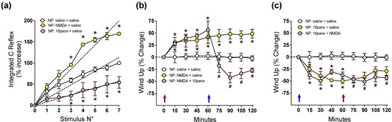Effect of intrathecal administration of NMDA followed by 10panx, or 10panx followed by NMDA, on C-reflex wind-up activity of neuropathic (NP) rats. NP rats receiving saline served as controls. Values are means ± SEM, n = 6 rats in each group. (a) Figure depicting data processing for determining spinal cord wind-up scores in neuropathic animals. C-reflex responses were elicited by repetitive electric stimulation (1 Hz) of the second and third toes to develop wind-up potentiation, a frequency-dependent increase in the excitability of spinal cord neurons. The C-reflex responses were integrated and plotted against the stimulus number, and the curves were normalized so that the reflex gain at the seventh stimulus represented a 100% increase. The slope of the least-squares regression line represents a control wind-up score, prior to any administration of drugs or saline. Thereafter, a 10 µL i.t. injection of either saline solution (white circles), 2 mM NMDA (yellow circles) or 300 µM 10panx (pink circles) was performed, and a new series of seven repetitive electric stimulations (1 Hz) was applied 30 min after, and the wind-up scores calculated from the slopes of the respective least-squares regression lines. The procedure was repeated using 6 animals per group, and the average data is presented as Figure a. Values are means ± SEM of data averaged from 6 rats per group, and the slopes of regression curves (dashed lines) represent wind-up scores obtained 30 min after each drug treatment: 16.15 ± 0.70 (saline), 28.48 ± 0.99 * (NMDA), and 8.14 ± 0.95* (10panx), the difference between slopes being statistically significant (one-way ANOVA, F2,15 = 132.7; * p at least <0.0001 with respect to saline group, Bonferroni multiple comparisons test). (b) Time course of wind-up activity (expressed as % change) in neuropathic rats immediately before and 15, 30, 45, 60, 75, 90, 105, and 120 min after an i.t. injection of NMDA or saline at time 0 (violet arrow), followed by an i.t. injection of 10panx or saline at time 60 min (blue arrow). Two-way repeated measures ANOVA revealed a “time” effect (F1.732,29.44 = 4.504). Intragroup analysis: * p at least <0.05 with respect to time zero min, # p at least <0.05 with respect to time 60 min, Bonferroni multiple comparisons test). Note the increased wind-up activity after MDMA, and the counteracting effect of 10panx. (c) Time course of wind-up activity (% change) in neuropathic rats after the inverse scheme of drug administration, i.e., an i.t. injection of 10panx or saline at time 0 (blue arrow), followed by an i.t. injection of NMDA or saline at time 60 min (violet arrow). Two-way repeated measures ANOVA revealed a “time” effect (F4.717,70.75 = 8.484). Intragroup analysis: * p at least <0.05 with respect to time zero min, # p at least <0.05 with respect to time 60 min, Bonferroni multiple comparisons test). Note the decreased wind-up activity after 10panx, and its preventing effect on the ability of NMDA to increase wind-up.