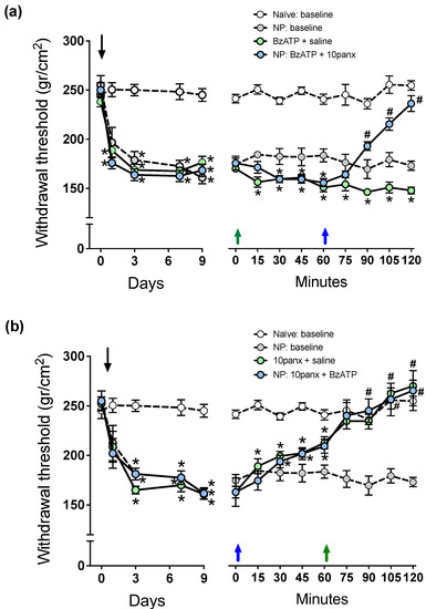 Effect of intrathecal administration of BzATP followed by 10panx, or 10panx followed by BzATP, on the mechanical nociceptive threshold (in g/cm2) of neuropathic (NP) rats. Naïve (baseline) and NP (baseline) rats without receiving any drug served as controls. Values are means ± SEM, n = 6 rats in each group. (a) Left panel: Time course of development of NP after sural nerve cutting, performed on day zero (downward arrow), during a 9-day period of follow-up. Two-way repeated measures ANOVA revealed a “time” effect (F2.992,59.84 = 65.12). Intragroup analysis: * p at least <0.05 in NP rats with respect to the threshold prior to sural nerve cutting, Bonferroni multiple comparisons test. Right panel: Time course of changes in mechanical nociceptive threshold after a 10 µL injection of saline i.t. or 150 µM BzATP i.t. on day 10 at time zero min (green upward arrow), followed by saline i.t. or 300 µM 10panx i.t. at time 60 min (blue upward arrow). Two-way repeated measures ANOVA revealed a “time” effect (F5.628,112.6 = 8.096). Intragroup analysis: * p at least <0.05 with respect to time zero min, # p at least <0.05 with respect to time 60 min, Bonferroni multiple comparisons test). Note the hyperalgesic effect of NMDA, and the counteracting effect of 10panx. (b) Left panel: Time course of development of NP after sural nerve cutting, performed on day zero (downward arrow), during a 9-day period of follow-up. Two-way repeated measures ANOVA revealed a “time” effect (F2.112, 42.24 = 50.46). Intragroup analysis: * p at least <0.05 in NP rats with respect to the threshold prior to sural nerve cutting, Bonferroni multiple comparisons test. Right panel: Time course of changes in the mechanical nociceptive threshold of NP rats on an inverse scheme of drug administration: a 10 µL injection of saline i.t. or 300 µM 10panx i.t. was administered at time zero min (blue arrow), and saline i.t. or 150 µM BzATP i.t. one hour later, at time 60 min (green arrow). Two-way repeated measures ANOVA revealed a “time” effect (F5.437,108.7 = 53.94). Intragroup analysis: * p at least <0.05 with respect to time zero min, # p at least <0.05 with respect to time 60 min, Bonferroni multiple comparisons test). Note the antihyperalgesic effect of 10panx, and its preventing effect on the ability of BzATP to induce hyperalgesia.