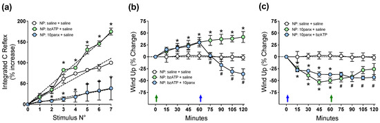 To test whether P2X7R requires the activation of Panx1 to initiate a pronociceptive signaling promoting spinal wind-up potentiation, the inverse schedule of drug administration was evaluated. The results (Figure 4c) show that i.t. 10panx (blue arrow) generated a significant decrease in wind-up activity at min 15 post injection, compared to preinjection activity (−27.3 ± 9.2%; * p < 0.05, two-way ANOVA followed by Bonferroni multiple comparisons test, n = 6), with a peak at 60 min (−50 ± 5.5%), and this decrease in wind-up potentiation remained significant until the end of the experiment compared to the preinjection condition (120 min post injection: −26 ± 5.9%, * p < 0.05, two-way ANOVA followed by Bonferroni multiple comparisons test, n = 6). A similar significant decrease in wind-up activity was also observed at min 15 post injection in a second group of rats treated with 10panx i.t. (−29.5 ± 4.7%; * p < 0.05, two-way ANOVA followed by Bonferroni multiple comparisons test, n = 6, compared to preinjection condition at t = 0 min), which was maintained up to 60 min post injection (−37.3 ± 7.2%). When these 10panx-injected animals (Figure 4c) were given an i.t. injection of BzATP 60 min later (green arrow), only a nonsignificant trend to increase wind-up activity occurred (# p > 0.05, two-way ANOVA followed by Bonferroni multiple comparisons test, n = 6). These results suggest that to initiate pronociceptive spinal signaling, P2X7R depends on an open state of the Panx1 channels.