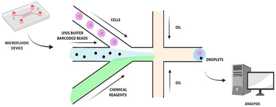 To make further progress in single-cell MS proteomics, a miniaturized and massively parallel sample preparation method was developed for high-throughput characterization: automated nano-ProteOmic sample Preparation (nPOP) (Table 1). This novel procedure makes it possible to increase the experimental batch size while also reducing batch effects, since it relies on piezo acoustic dispensing to isolate cells individually in volumes lower than 20 nL and performs all steps of the protocol in small droplets on a fluorocarbon-coated slide. The workflow sample preparation includes cell isolation and lysis and protein digestion, followed by labeling of peptides and clustering of samples [20]. To assess the nPOP performance for single-cell analysis, two cell lines, Hela cells and U-937 monocytes, were used, sorting cells by both type and cycle phase. This allowed a reduction of sample volume by 100-fold compared to the mPOP method, enabling a more comprehensive investigation of the cell division cycle. Furthermore, characterization of cells according to their division cycle phase was possible by integrating nPOP with the Single-Cell ProtEomics by Mass Spectrometry (SCoPE2) workflow. Analysis of the proteins in the cell lines U-937 and HeLa revealed significant similarities and distinctions during cell cycle progression; hence, nPOP allowed a deeper single-cell proteomic analysis than the mPOP sample preparation method [20]. In addition, microfluidics-based toolkits for SCP are also emerging, offering the following benefits: i. More than twenty functional proteins can be simultaneously analyzed based on individual cell statistical numbers; ii. Cell behaviors (e.g., motility) and protein assays can be correlated; iii. Measurements of cell–cell interactions can be performed by the extensions to quantified cell populations; iv. To allow further analysis and culturing, rare cells can be identified and functionally separated; v. Some assays can provide a conduit between biology and the physicochemical laws [25]. Using open microfluidic platforms will reduce the dimensions and maintain the general form factor of the microwell plate, thereby minimizing surface exposure and enabling sample recovery through nano-pipetting [1,25]. Other approaches have been developed by contact pin-printing methods in which pipetting robots automatically dispense liquids at the Transmission Electron Microscopy grid, such as a capillary-driven microfluidic single-use device [26]. These approaches have the advantages of reducing the volumes of the sample as well as providing automation possibilities, while they also have some disadvantages, such as the need for special instrumentation, and representing a significant increase in complexity and being more time consuming than the manual protocol [26]. Mukhitov et al. suggested a microfluidic device for the preparation of the grids, in which the grid is contained in a microfluidic canal and the liquid for sample preparation is driven by an external pressure pump, thereby improving preparation consistency [27]. Moreover, flow cytometry miniaturization and blood cell counting have been attracting attention in recent years [28]. Reducing the volumes for sample preparation can be beneficial for minimizing adsorption losses and increasing sample concentrations, so sample reaction with trypsin and other reagents can be more efficient [1]. Automated sample handling is necessary in order to standardize the sample preparation workflow, the operations of which are typically performed manually. A fluid standardized plumbing system in which the device allows the full volume to be mixed and processed could enable large volumes to be processed, leading to reduced costs, and increased diagnostic accuracy [28]. For example, a droplet-based microfluidic approach enables the miniaturization of reactions possible by segmentation into droplets containing femto- to micro-liter volumes, which assists biochemical screening and enzyme kinetic studies and assays (Figure 2). As each compartmented droplet performs a single reaction, several reactions can be carried out in parallel. Digital microfluidics, a droplet manipulation method using electrowetting, enables sequential operations to be performed on slide-fixed cell and tissue samples using low volumes in a non-continuous manner. The ideal protocol would automate techniques for cell staining on a microfluidic device for efficient and uniform labeling using immunocytochemical stains and improving the yield of cytogenetic analysis [28].