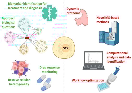 SCP offers a unique perspective that will drive the further development of single-cell biology since it enables the analysis of hundreds of individual cells per day while quantifying thousands of proteins, allowing the characterization of the functional state of cells [47,82] (Figure 4). Furthermore, the in-depth proteogenomic analysis of individual cells allows the dissection of pathophysiological mechanisms in heterogeneous tissues [6,83]. SCP requires the adoption of MS-based methods, the application of strict quality control standards, and continuous nanotechnology progress, introducing numerous innovations (such as highly parallelized analysis) while increasing throughput, quantitative accuracy, and accessibility [82]. Making SCP affordable also requires computational pathways for the analysis and interpretation of the data, which can be explored by scRNA-Seq software tools [41,82]. Understanding the differences between bulk and single-cell spectra is critical for the optimization of SCP algorithms [47,82] (Figure 4).