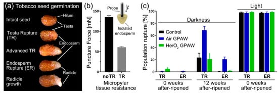Nicotiana tabacum seed germination. (a) Different stages of the germination process showing testa rupture (TR), endosperm rupture (ER) and radicle elongation. (b) Force needed to puncture the micropylar part of the endosperm before and after testa rupture. (c) Comparison of 0 and 12 week after-ripened (33% RH and 20 °C) seeds’ testa rupture (TR) and endosperm rupture (ER) (7 days after imbibition in both dark and light germinated in water or gas-plasma-activated water (GPAW)).