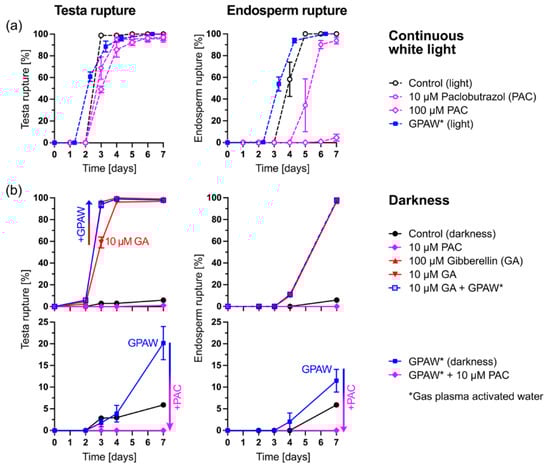 The effects of gas-plasma-activated water (Air GPAW) and GA biosynthesis inhibition on the time courses of Nicotiana tabacum testa rupture (TR) and endosperm rupture (ER). (a) Effect of the GA biosynthesis inhibitor paclobutrazol (PAC) and GPAW on TR and ER in continuous white light (ca. 111 µmol m−2 s−1). (b) The effects of GPAW, GA and PAC treatment on the TR and ER of tobacco seeds imbibed in darkness. Results are shown as mean ± SEM of three petri dishes each with 40 seeds imbibed at 20 °C.