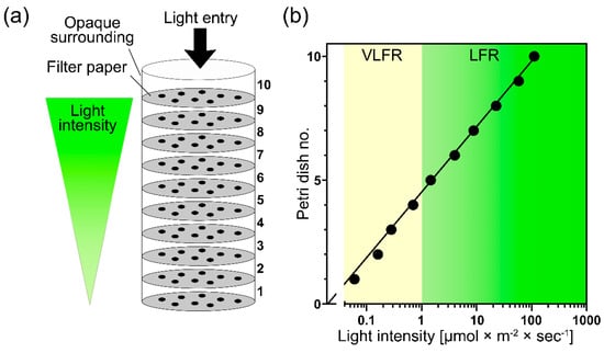Experimental design and continuous white-light intensity values of the (a) ‘light filter tube’ consisting of 10 stacked petri dishes used to assess changes in light dependency for germination of dormant Nicotiana tabacum seeds. The dishes were wrapped in opaque material, limiting light access to the top of the petri dishes and generating an exponential decreasing light intensity through each layer. (b) White-light intensities in the petri dish stack are expressed as photon fluence rate (µmol m−2 s−1). The very low fluence response range (VLFR) is shaded yellow (<1 µmol m−2 s−1), and the low fluence response (LFR) range is on the right segment of the graph (>1 µmol m−2 s−1).