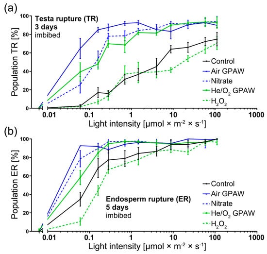 Increasing light intensity, corresponding to values typical for very low fluence response (VLFR) and low fluence response (LFR), caused significant differences in TR and ER percentages for both GPAW treatments when compared to the control (Figure 4). Both GPAW treatments lead to increased TR (3 days post imbibition) in contrast to the control (p < 0.05) (Figure 2a). For ER (5 days post imbibition), all treatments in the VLFR range, except the direct H2O2 treatment, resulted in an increased ER compared to the control (Figure 4b).