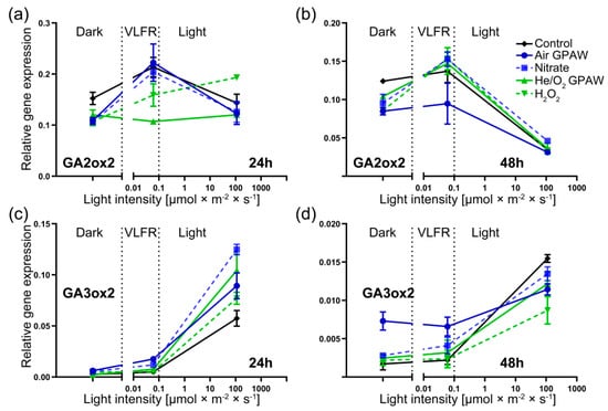 Under VLFR light conditions, the expression of GA2ox2 was higher than that in darkness. No significant difference was exhibited in nitrogen-containing treatments at 24 h (Air GPAW and Nitrate); however, the He/O2 GPAW treatment significantly reduced GA2ox2 expression by 49.9%, and H2O2 showed a 25.7% reduction (Figure 5a). At 48 h post imbibition under VLFR light conditions, all treatments apart from Air GPAW displayed similar expression levels to the control; Air GPAW reduced expression by 30.9% (p < 0.05). Under full light, GA2ox2 expression was down-regulated (48 h) and showed no significant differences between treatments and the control except for H2O2 at 24 h (significant increase of 34.7%; p < 0.05) (Figure 5b).