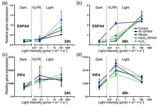Relative gene expression of freshly harvested Nicotiana tabacum seeds displaying photo-dependent dormancy and germination responses in three different continuous light conditions (darkness (0 µmol m−2 s−1), VLFR-intensity white light (0.05 µmol m−2 s−1) and LFR-intensity white light (111 µmol m−2 s−1)) at 2 time points (24 and 48 h). Seeds were incubated at 20 °C with 5 treatments: Air GPAW, He/O2 GPAW, Nitrate (5 mM KNO3−), H2O2 (300 µM), and water. (a,b) Gene expression of EXPA4 at 24 and 48 h, respectively. (c,d) Gene expression of PIF4 at 24 and 48 h, respectively.