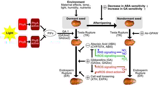 Schematic presentation of ROS and RNS signalling pathways. Phytochromes are activated and deactivated by red and far red light. Active phytochromes trigger cascades that lead to germination. Dry storage (after-ripening) reduces the dormancy status and enables seeds to complete germination under favourable conditions. Reactive oxygen species (ROS) and reactive nitrogen species (RNS) perform oxidative and nitrosative signalling to induce seed germination and release dormancy, particularly through cross-talk with plant hormones such as abscisic acid (ABA) and gibberellin (GA). Apoplastic ROS (aROS) mediates endosperm weakening and radicle growth via the direct chemical scission of cell walls [,].