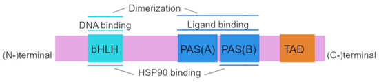 The amino acid sequence of the bHLH and PAS domains is evolutionarily highly conserved. The bHLH domain can be divided into an HLH domain and a basic domain and is involved in AhR binding to DNA and in protein dimerization [23,24]. The PAS region participates in ligand binding and is thought to be the site of protein–protein interactions during dimer formation; PAS B partially overlaps with the heat shock protein 90 (HSP90)-binding site [21,25]. The transcription activation domain serves as a mediator of the transcriptional activation of downstream genes [26].