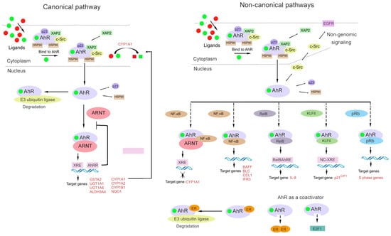 The AhR signaling pathway involves both classic (canonical) and non-classic (non-canonical) signal transduction mechanisms (Figure 2) [31,84].