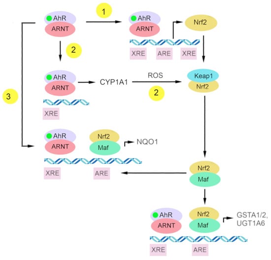 There is also confirmation of the functionality of these xenobiotic-responsive element-like elements, and a direct binding of AhR to the Nrf2 promoter has been proven [200]. It has been reported that Nrf2 expression is at least partly regulated by AhR inducers through the activation of multiple xenobiotic-responsive elements in the Nrf2 promoter. This molecular event represents a direct connection between AhR and Nrf2 and places the Nrf2–ARE pathway downstream of AhR–XRE activation in certain scenarios [104].