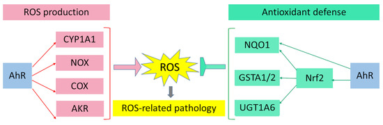 AhR is reported to be responsible for the toxic cellular effects of TCDD via pro-oxidant mechanisms [34,116]. There is convincing evidence that the activation of AhR-dependent detoxification of such environmental stressors as TCDD, polycyclic aromatic hydrocarbons, polychlorinated biphenyls, and effects of ultraviolet radiation gives rise to oxidative stress and to the production of reactive oxygen species, thus inducing oxidative damage to DNA, lipids, and other cellular macromolecules [117,118,119,120]. Several enzyme systems, including CYP1A, NOX, COX, and possibly aldo–keto reductase (AKR) 1, are regulated through the AhR signaling pathway in terms of their ability to generate reactive oxygen species in various cell types and tissues [121,122,123,124].