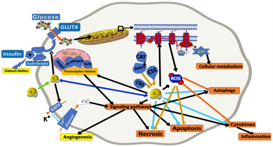 The mitochondria control energy homeostasis and regulate ROS production [75]. Mitochondria play a significant role in the mechanism of fatty acids β-oxidation. On the other hand, mitochondrial dysregulations occur in insulin resistance. The number of mitochondria in hepatocytes decreases in CSE-deficit cells. Hyperglycaemia leads to the generation of mitochondria superoxide, which causes the synthesis of oxidants and endothelial dysfunction. H2S works as an electron donor to the respiratory chain and plays a therapeutic role in DM and associated vascular diseases.