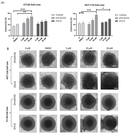 3.5. In Vitro Screening of the Zinc Complexes: 2D and 3D Settings