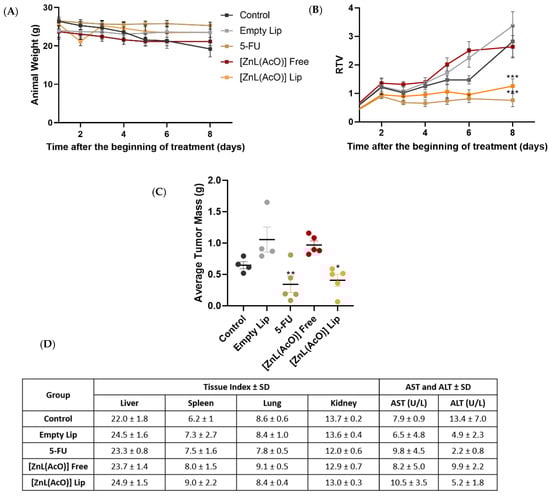 Ribeiro N, Albino M, Ferreira A, Escrevente C, Barral DC, Pessoa JC, Reis CP, Gaspar MM, Correia I. Liposomal Formulations of a New Zinc(II) Complex Exhibiting High Therapeutic Potential in a Murine Colon Cancer Model. International Journal of Molecular Sciences. 2022; 23(12):6728. https://doi.org/10.3390/ijms23126728