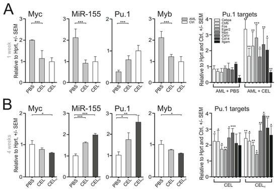 Based on the previous results, we first investigated whether the MYB inhibitor (CEL) affects leukemic differentiation by regulating PU.1 levels. To do this, we used a hypomorphic PU.1 model of AML/MPN in mice [], and treated these mice upon AML development with CEL. The experimental conditions in the mice were previously optimized []. In order to understand the effect of the therapy at the molecular level, we monitored the consequences of CEL administration in the short (1 week) and medium (4 weeks) terms. Treatment with CEL for one week significantly reduced the levels of miR-155 as well as other CEL targets (Myb, Myc) in magnetically isolated c-Kit-positive myeloid progenitors compared to the control vehicle in treated AML-bearing 5–6-month-old PU.1ure/ure or control age-matched mice (Figure 1A). As expected, the CEL treatment also affected the miR-155 and PU.1 levels in progenitor cells, similarly to what has been previously observed in vitro using Myb siRNA [], via upregulating PU.1 targets (Figure 1A, right). With prolonged CEL treatment (for 4 weeks), the PU.1 program was further amplified (Figure 1B), but this was followed by an unexpected upregulation of miR-155 (Figure 1B). The upregulation of miR-155 represents a compensatory mechanism that activates miR-155 in progenitor cells at a certain threshold level of PU.1 []. The PU.1-dependent upregulation of miR-155 has previously been shown to counteract differentiation and promote a myeloproliferative state in mice []. Indeed, the medium-term treatment with CEL (for 4 weeks) increased the proportion of early bone marrow (BM)-derived myeloid progenitors that could not fully complete their differentiation fate, leading to their accumulation, and consequently splenic enlargement (Figure 1C,D and Supplementary Figure S1A). CEL therapy was also unable to significantly increase the numbers of mature neutrophils and monocytes in PU.1ure/ure mice (Figure S1B), but we observed a trend in this direction. While a short-term treatment with CEL stimulated the growth of myeloid colonies (CFU) (Figure 1E) and blocked immature progenitor clusters (>50 cells/cluster) (Figure 1E), the medium-term therapy with CEL was unable to suppress the growth of clusters in semisolid media upon replating of progenitors (Figure 1F). This suggested that CEL therapy is compensated at the level of the progenitors, in which it is unable to fully force their differentiation. The higher proportion of early PU.1ure/ure progenitors induced by medium-term CEL therapy represented the early myeloid Mac1+c-Kit+ progenitors and late monocyte–granulocytic (Mac1+Gr1+) precursors (Figure 1G). To test the role of elevated miR-155 in CEL-induced MPN-like features, we used anti-miR-155 (AM155) on top of the CEL therapy, which (as expected) significantly decreased the miR-155 level and lowered fractions of both Mac1+Gr1+ and Mac1+c-Kit+ BM-derived cells in PU.1ure/ure mice (Figure 1G). In conclusion, short-term PU.1ure/ure-AML treatment with CEL blocked the Myb and miR-155 levels, thereby deregulating PU.1 and inducing myeloid differentiation. However, medium-term CEL therapy led to myeloid cell accumulation and splenomegaly. This phenomenon of unsustainable leukemic differentiation was attributed to the compensatory upregulation of miR-155, as suggested by the experiment in which the CEL therapy was complemented by AM155 (Figure 1G).
