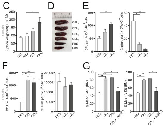 Compensatory effect of miR-155 on CEL effects on murine PU.1ure/ure AML: (A) 1 week CEL therapy of 3 i.p. 10 μg injections, mRNA expression in BM c-Kit+ blasts, WT (n = 6), AML-bearing 5–6-month-old PU.1(ure/ure) mice (n = 6), determined by qPCR. Fold changes (y axis), controls set to 1, mean ± SEM, p-values (t-test, unpaired, two-tailed); (B) 4 week CEL therapy with either standard weekly dose or three-fold escalated dose (H), mRNA expression of PU.1 targets normalized on AML + PBS (A); (C) spleen weight AVG ± SD, 4-week CEL therapy, WT (n = 3), PU.1ure/ure (n = 3); (D) spleen photographs; (E) CFU and immature cell colonies (clusters) cultured from c-Kit+ cells of PU.1ure/ure mice (n = 3) after 4-week CEL therapy; (F) CFU and immature colony cultures after replating; (G) effects of 4-week AM155 and CEL on progenitor cells. Flow cytometry of BM from PU.1ure/ure (n = 3). Mean ± SEM, p-values (t-test, unpaired, two-tailed) * p < 0.05, ** p < 0.05, *** p < 0.005.