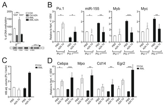 The PU.1 gene is relatively complexly regulated at the level of several enhancers and at a magnitude of several kb prior to the start of transcription. The deletion of a particular enhancer called the URE (upstream regulatory element), which attracts a number of regulatory transcription factors, disrupts PU.1 expression, such that the URE is unable to associate with and effectively stimulate the PU.1 promoter []. In addition to the transcriptional regulation of PU.1 levels, there are other mechanisms, including at the post-transcriptional level. For example, the antisense transcript of PU.1 can inhibit PU.1 expression by modulating mRNA translation []. Another RNA from a set of small non-coding microRNAs, called miR-155, which is expressed in hematopoietic stem and progenitor cells, can also strongly inhibit PU.1 expression, even representing an oncogenic factor mediating myeloid progenitor expansion [] and playing an important role in leukemogenesis []. Another factor influencing miR-155 and PU.1 levels is the transcriptional activator MYB, which is overexpressed in immature hematopoietic cells and leukemic progenitors. Its role is to regulate proliferation and differentiation in this early cellular compartment []. We have demonstrated that miR-155, MYB, and PU.1 have interconnected regulatory relationships, meaning a change in the level of one of them automatically adjusts the levels of the other two factors, leading to significant phenotypic differences, as shown in two relatively distinct hematopoietic systems [,]. At the same time, we have previously shown that DNA methylation represents a barrier to effectively increasing PU.1 levels in a model of AML [].
