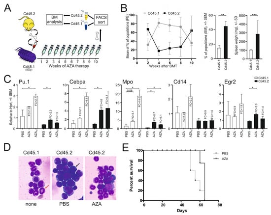 To determine whether the AZA treatment inhibited leukemic growth in vivo, we transplanted highly aggressive PU.1ure/urep53−/− progenitor cells (expressing Cd45.2) into lethally irradiated recipient mice expressing Cd45.1. The AML engraftment of Cd45.2 donor cells lasted for the next 10 weeks and accounted for more than 60% of the BM hematopoiesis (Figure 3A,B). We also observed that xenografted mice developed marked splenomegaly (Figure 3B, right). Mice with documented PU.1ure/urep53−/− chimerism were then treated with AZA in two different dosing schedules that resembled that used in human MDS patients, which is also comparable to that previously tested elsewhere in mice []. We also evaluated the myeloid mRNA program in KIT proto-oncogene receptor tyrosine kinase (c-Kit)-positive progenitors from both donor and recipient cells. As shown in Figure 3C, AZA within 10 weeks upregulated PU.1 and its program in both normal and AML cells. The AZA treatment reduced the amount of myeloblasts visualized in cytological smears (Figure 3D), and in contrast activated the appearance of normally differentiating myeloid cells. The differentiation of AML progenitors along with the upregulation of the PU.1 program was also associated with the prolonged survival of AZA-treated transplanted mice (Figure 3E), although because of the particular experimental design, we did not measure a specific time difference in survival. Again, we confirmed that AZA is able to increase PU.1 levels in AML lacking the URE, and we also observed that this treatment additionally prolonged the survival of mice with AML. Thus, we again indirectly confirmed that PU.1 is a very important barrier to AML pathogenesis and that hypermethylation of its promoter is abrogated by AZA therapy, which may play a key role in its targeting effects.