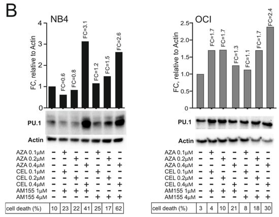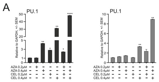 Previous studies indicated that while the deletion of PU.1 expression abolishes myeloid development, a reduction in PU.1 levels has an apparent leukemia-promoting effect []. The pathways by which PU.1 is reduced and the gradual activation methods of the differentiation block may be multiple, both through disruption of the transcriptional regulation of the PU.1 gene and post-transcriptionally. Our previous work showed that miR-155 is under the influence of the oncogenic transcription factor MYB []. The inhibition of MYB (by Celastrol, CEL) was demonstrated to block AML growth by unlocking the interaction of MYB and p300 at the promoters of its oncogenic targets []. CEL is a quinone methide triterpene by chemical composition that is obtained from the extract of the thunder god vine root, and the number of its therapeutic targets is expanding. In our further work, we showed that not only by blocking miR-155 or MYB, but also by using a DNA methylation inhibitor (5-Azacytidine, AZA), we could increase PU.1 expression quite efficiently, thereby promoting myeloid cell differentiation and suppressing the leukemogenic phenotype of the cells []. In our current project, we built on previous hypotheses and asked whether a combined action to increase PU.1 levels can establish a leukemic differentiation effect that would be of a more sustainable character, thereby enhancing the redirection of AML cells while suppressing the leukemic phenotype.
