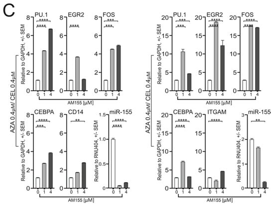 Combined CEL/AZA/AM155 therapy induces PU.1 program in human AML. Triplicate experiments, NB4 cells shown on left, OCI-M2 on right: (A) mRNA expression of PU.1, 72 h treatment of indicated agents and their combinations, final concentrations indicated; (B) protein levels of PU.1 and β-actin upon 72 h therapy with AZA, CEL, AM155; μM concentrations indicated, cell death % shown by the table; (C) mRNA expression at 72 h upon treatment with 0.4 μM AZA and 0.4 μM CEL. On top are 1 μM and 4 μM AM155. Mean ± SEM, significance indicated by star (* p < 0.05, ** p < 0.05, *** p < 0.005, **** p < 0.0005).